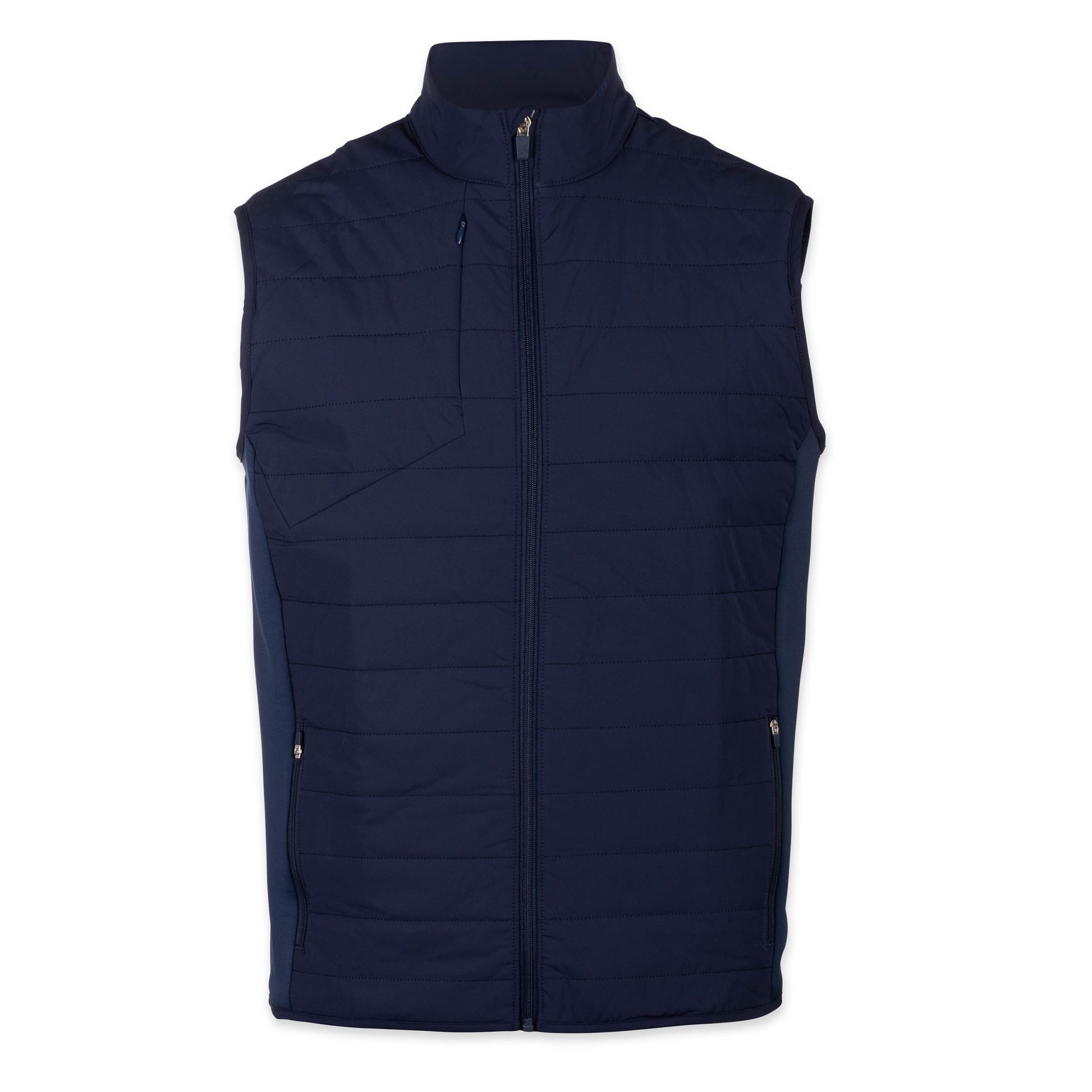 The rear panel is crafted from our signature four-way stretch fabric, providing exceptional flexibility and ease of movement. Designed with a modern, tailored fit, the Hybrid Vest is a standout choice for everything from brisk mornings on the course to casual nights out. Timeless yet refined, it's the ultimate fusion of comfort, function, and elevated design.